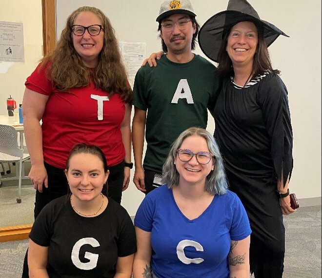 10/2024| Lab costume contest from the departmental Halloween Potluck. The lab went as nucleotides—A, T, G, C!