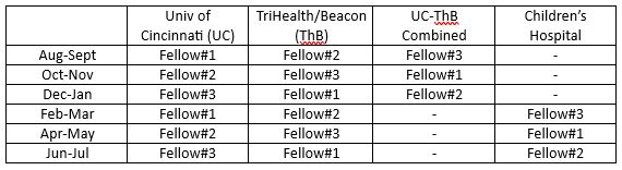 Fellows will be on call approximately once every fourth night and every fourth weekend. Fellows take call at the University Hospital with primary Hand Call every odd day and at two local private hospitals with an attending physician present.