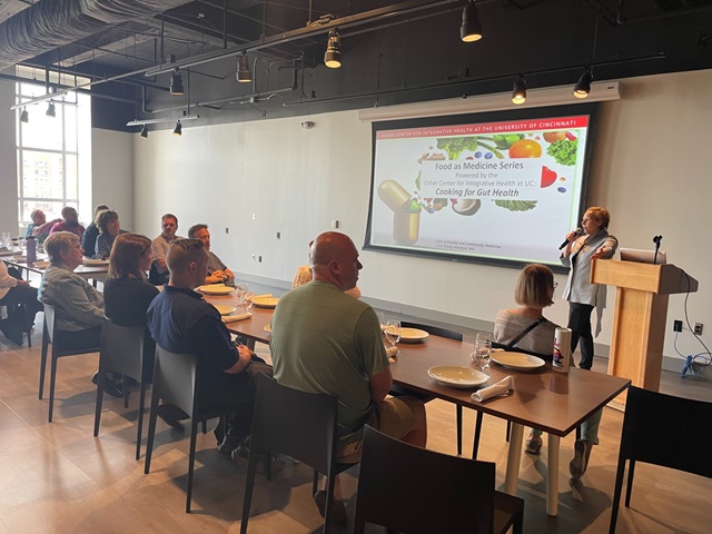 The Osher Center is also collaborating with the Cincinnati Museum Center on teaching kitchen events hosted at the new Cr(EAT)e Culinary Studio. The Food as Medicine series is the first adult programming to be offered at the studio and focuses on culinary medicine, teaching the impact of food on your health, and introducing participants to healthy, plant-based recipes. The first event in the series, Cooking for Gut Health, was held in May and featured the expertise of Lauri Nandyal, MD. The next event in the series will be held on October 23, 2024, and feature Pamela Sharpe, FNP-BC, nurse practitioner and trained chef.